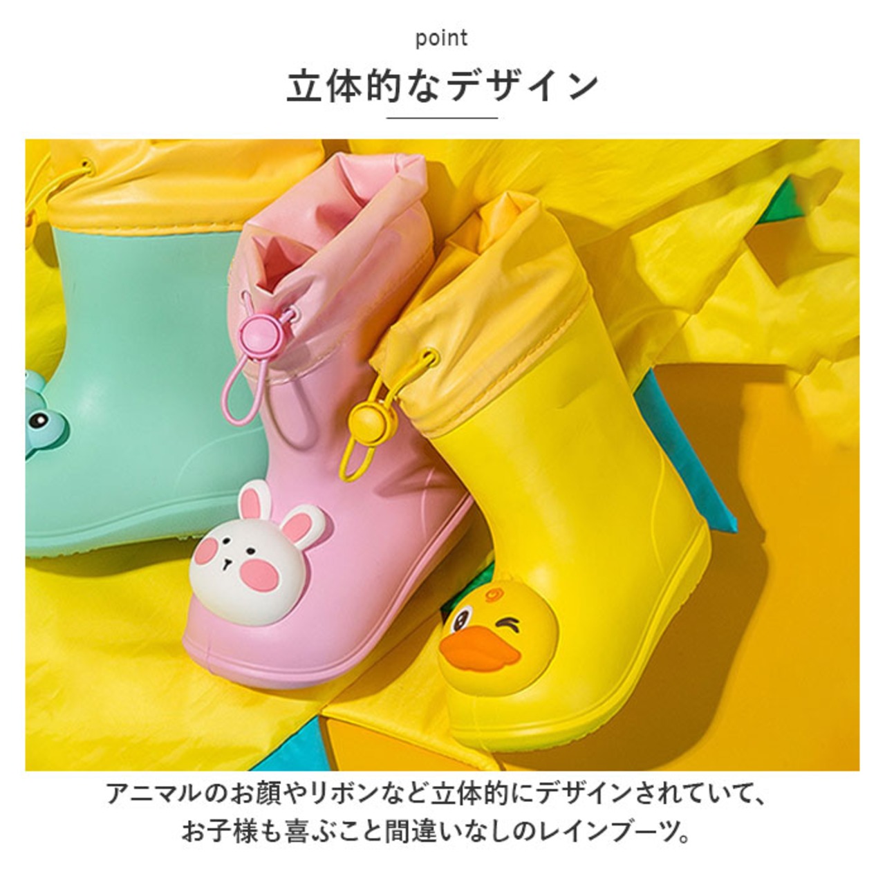 ・アニマルのお顔やリボンなど立体的にデザインされていて、お子様も喜ぶこと間違いなしのレインブーツ。