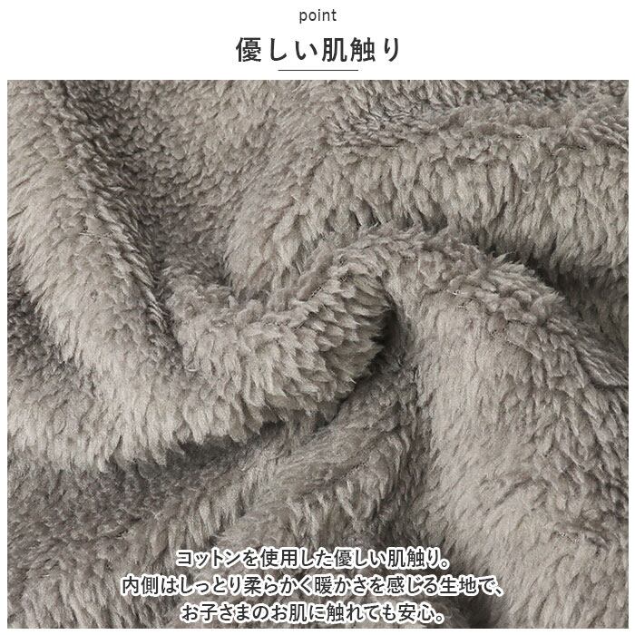 ・コットンを使用した優しい肌触り。内側はしっとり柔らかく暖かさを感じる生地で、お子さまのお肌に触れても安心。