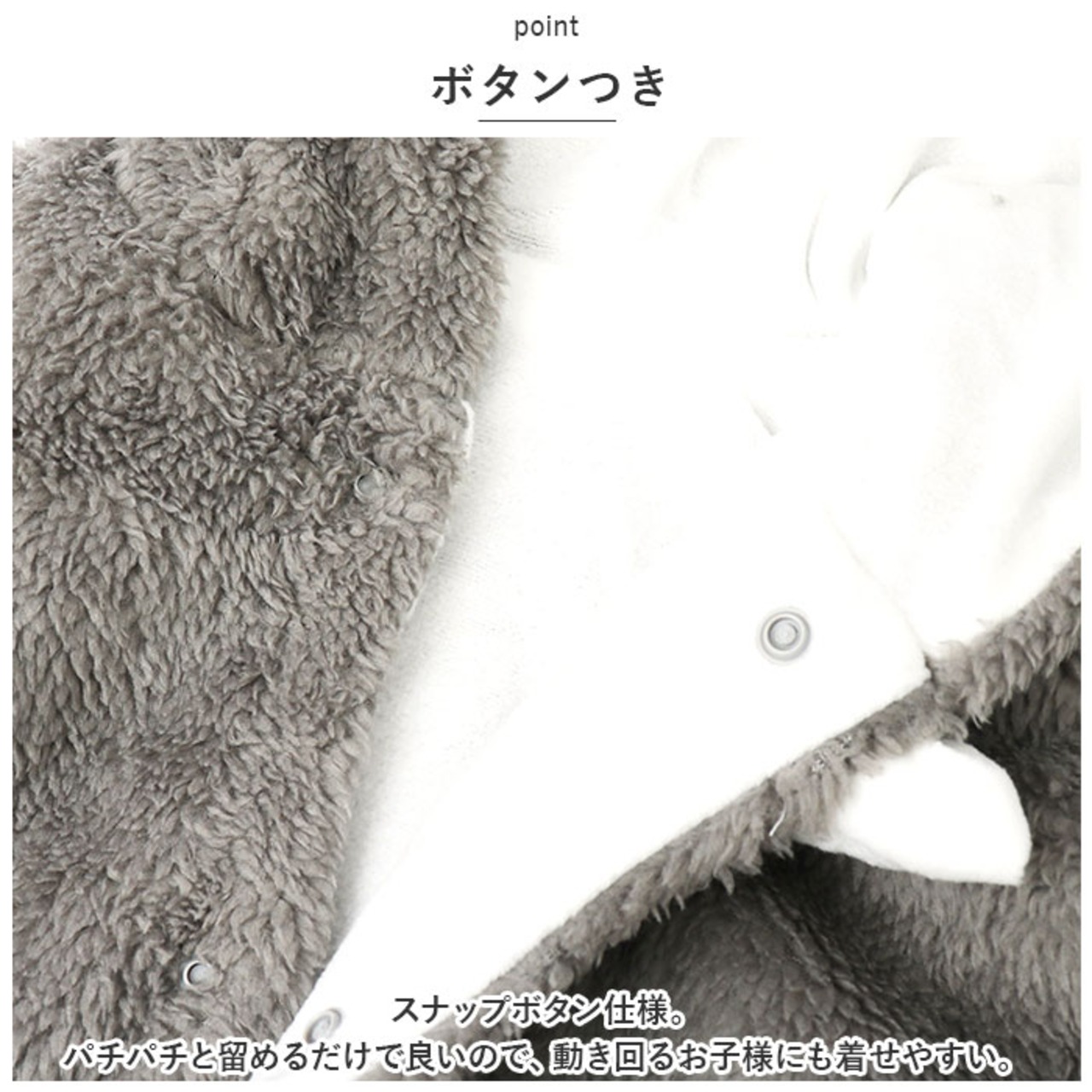 ・スナップボタン仕様。パチパチと留めるだけで良いので、動き回るお子様にも着せやすい。
