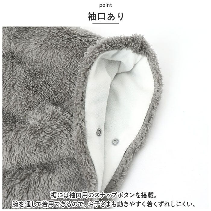 ・裾には袖口用のスナップボタンを搭載。腕を通して着用できるので、お子さまも動きやすく着くずれしにくい。