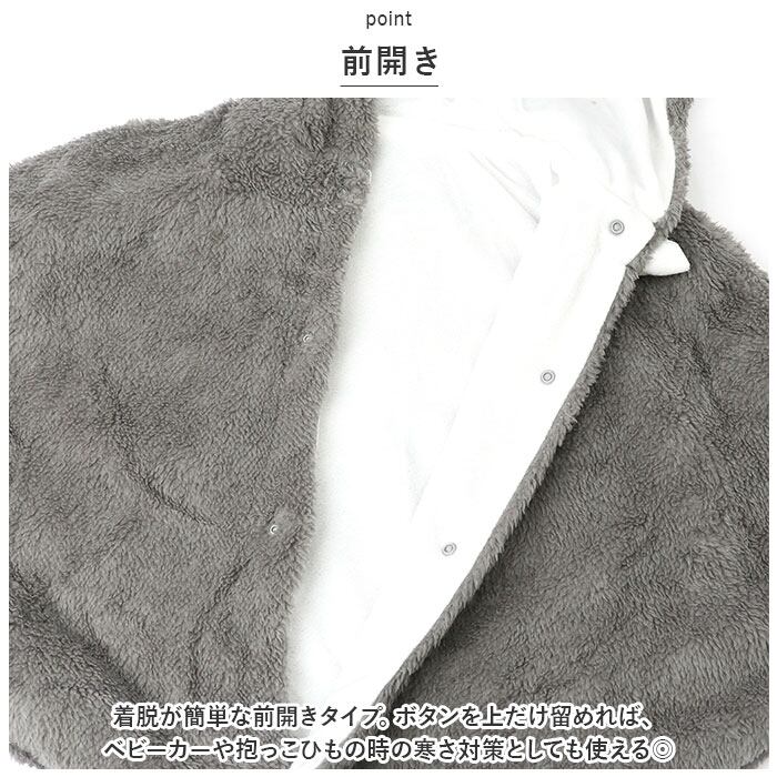 ・着脱が簡単な前開きタイプ。ボタンを上だけ留めれば、ベビーカーや抱っこひもの時の寒さ対策としても使える◎