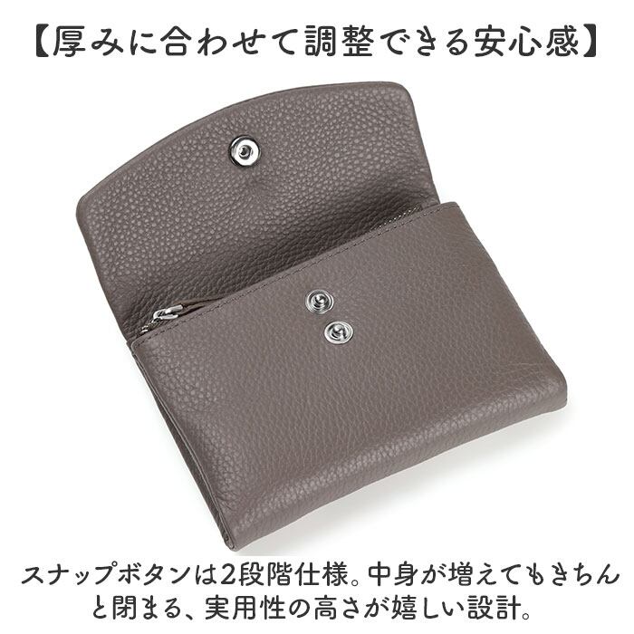 ・スナップボタンは2段階仕様。中身が増えてもきちんと閉まる、実用性の高さが嬉しい設計。