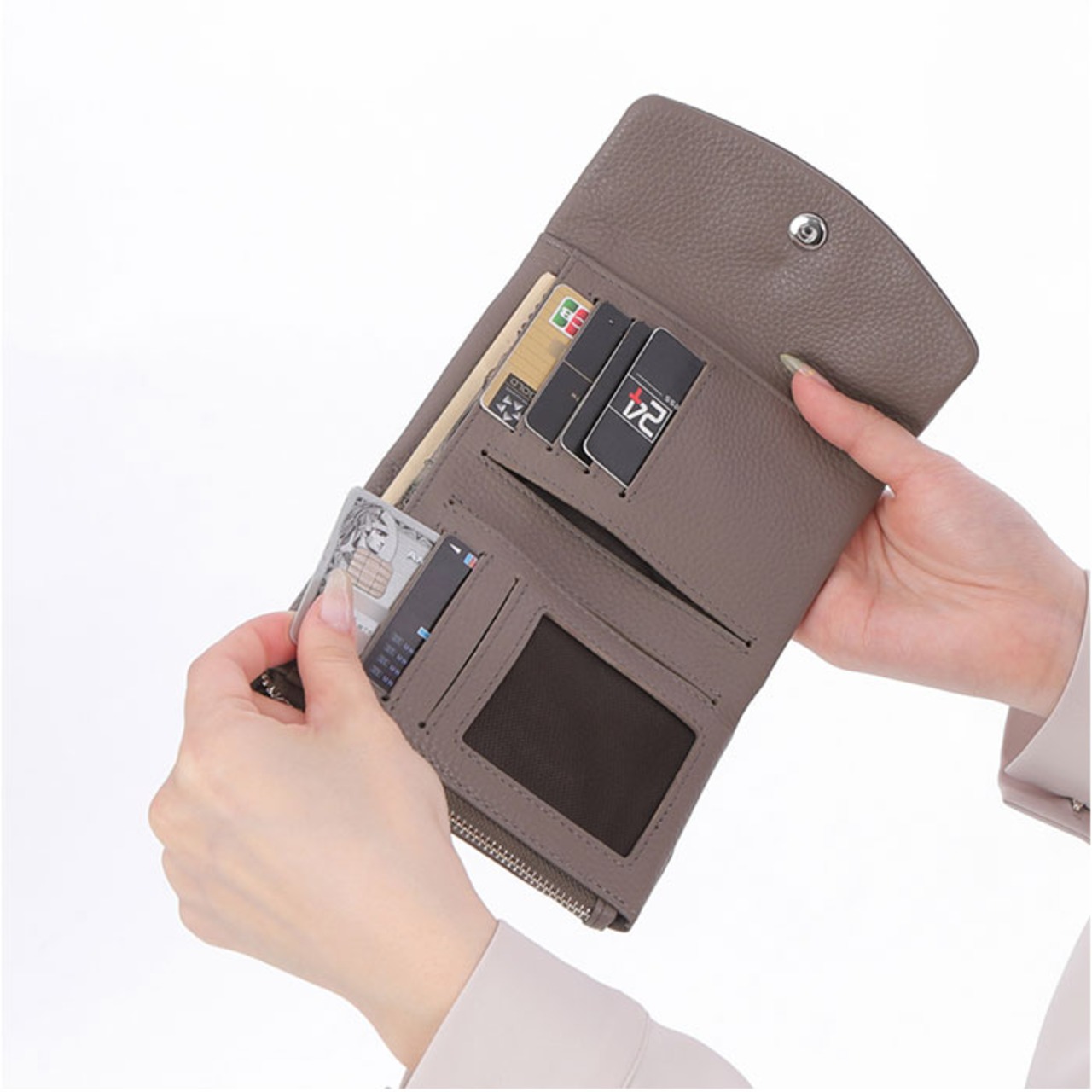 ・内側:小銭入れ×1、カードポケット×7、フリーポケット×2、札入れ×1、ファスナーポケット×1