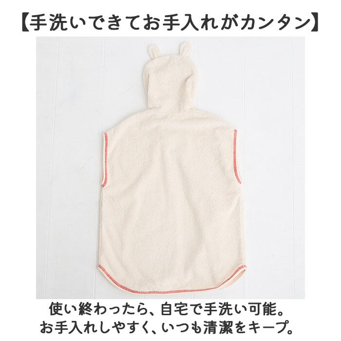 ・吸水性の高い両面パイル素材。お風呂上がりや水遊びの際に、頭を拭きながら羽織れるアイテム。
