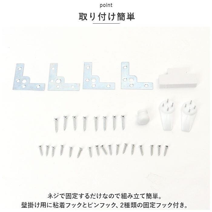・ネジで固定するだけなので組み立て簡単。壁掛け用に粘着フックとピンフック、2種類の固定フック付き。