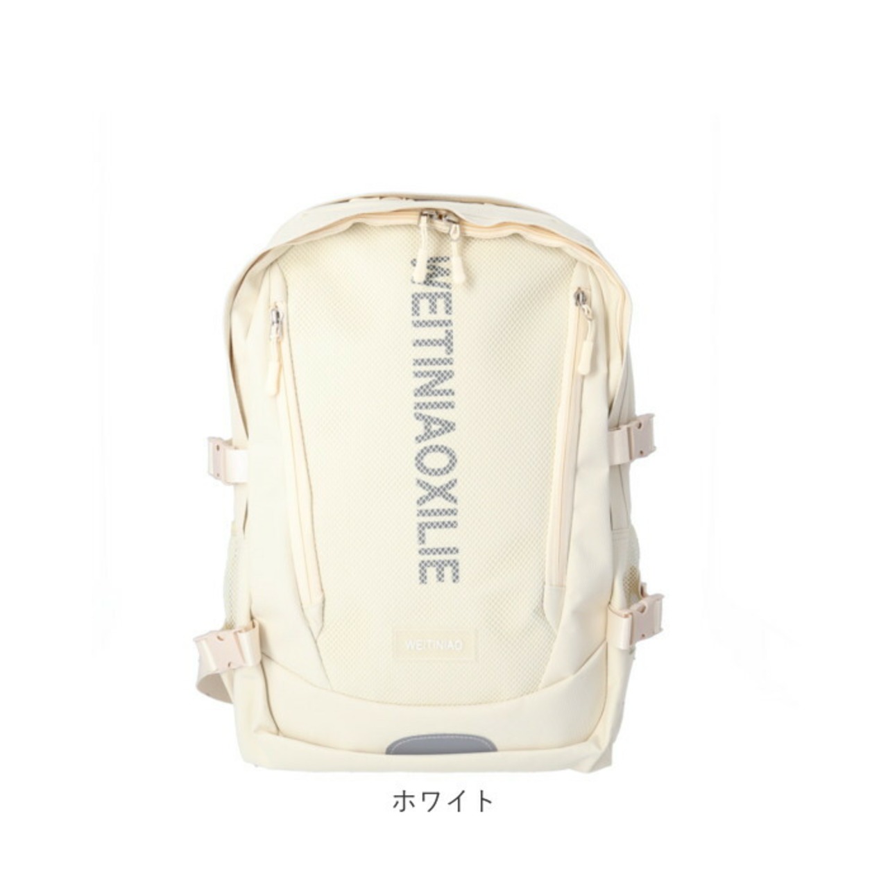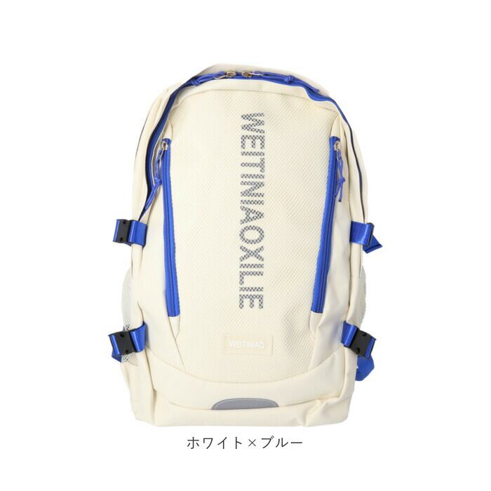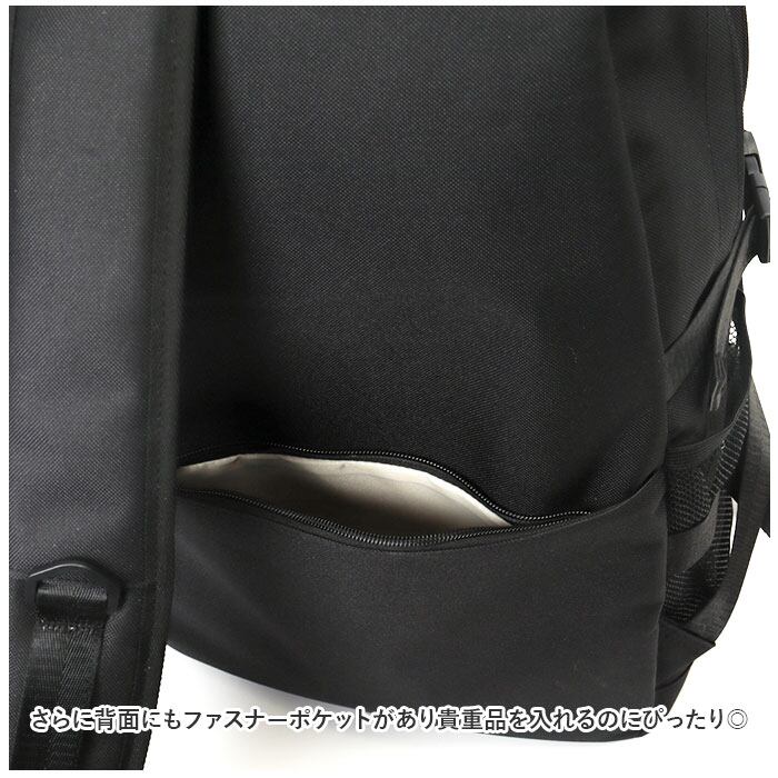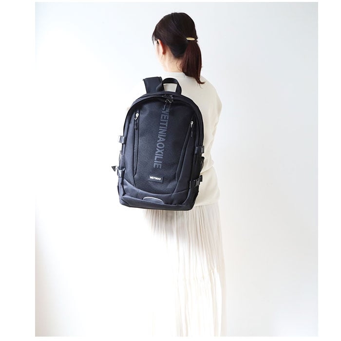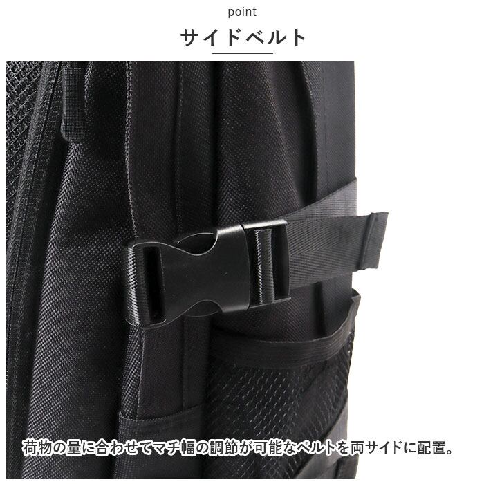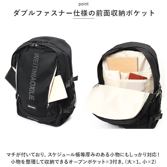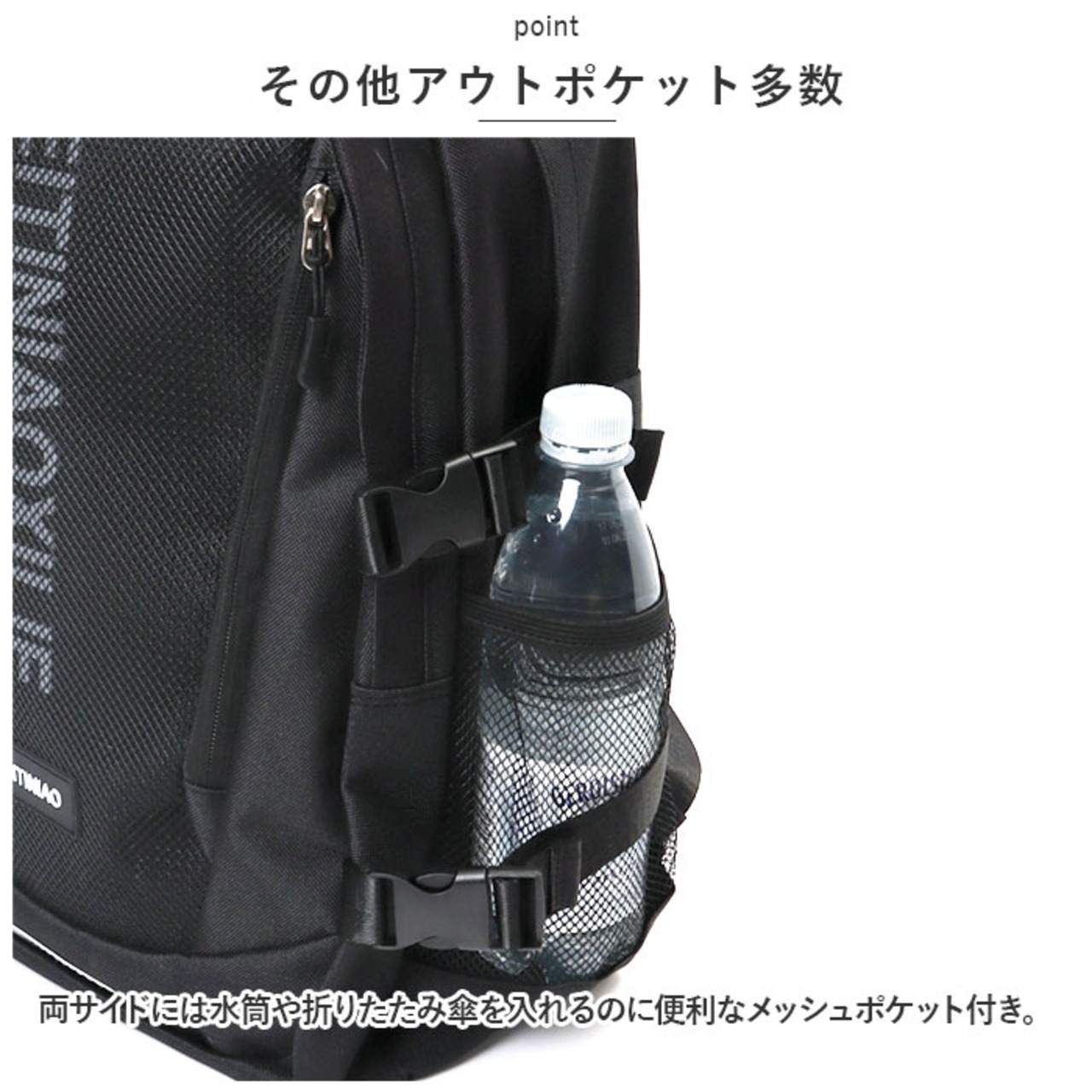 ・リュックフロントにファスナー式のアウトポケット×2を装備し、両サイドには水筒や折りたたみ傘を入れるのに便利なメッシュポケット付き。
