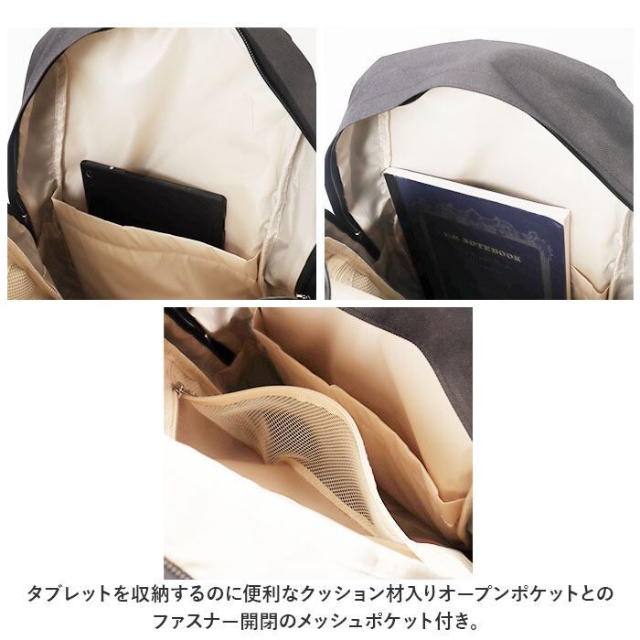 ・タブレットを収納するのに便利なクッション材入りオープンポケットとのファスナー開閉のメッシュポケット付き。