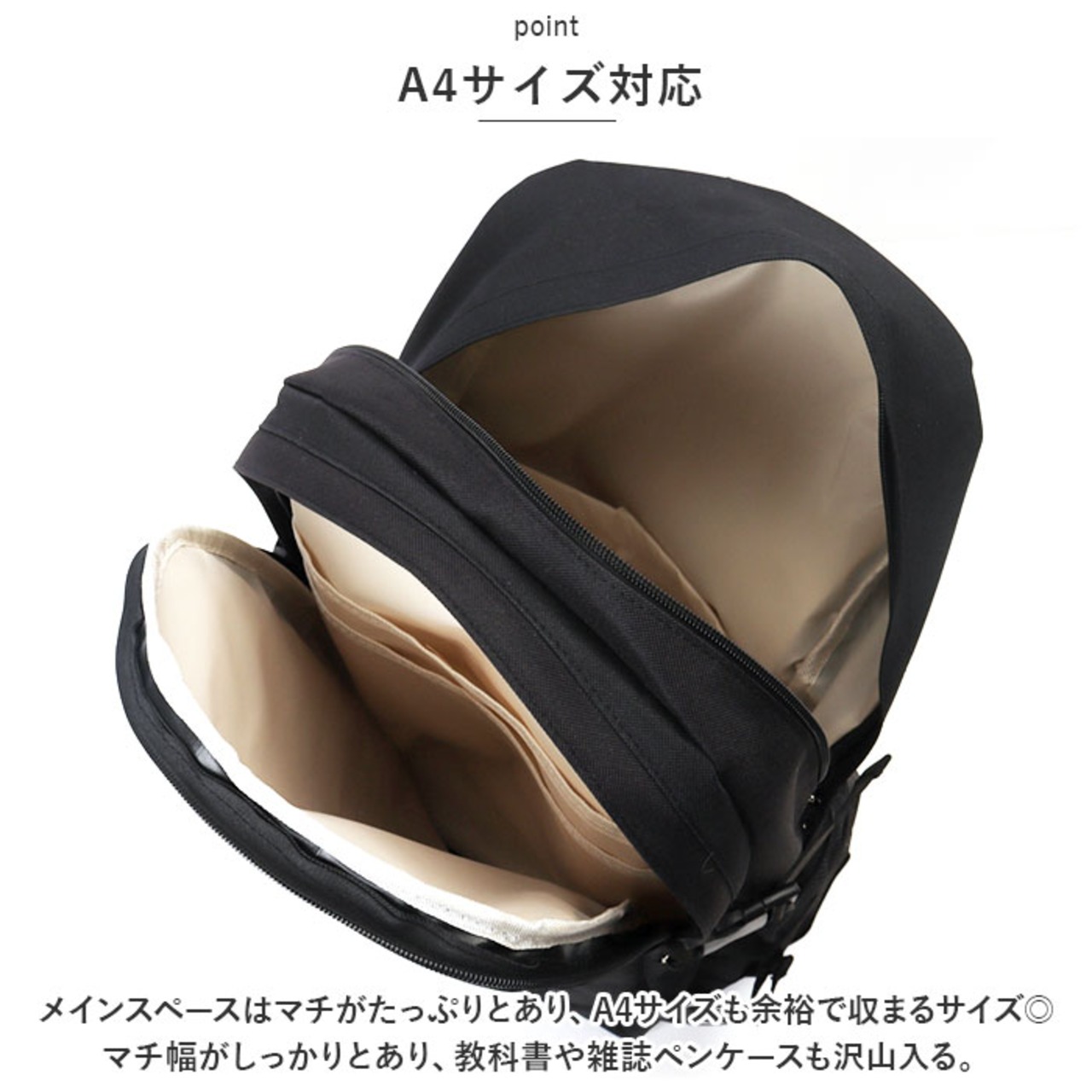 ・メインスペースはマチがたっぷりとあり、A4サイズも余裕で収まるサイズ◎