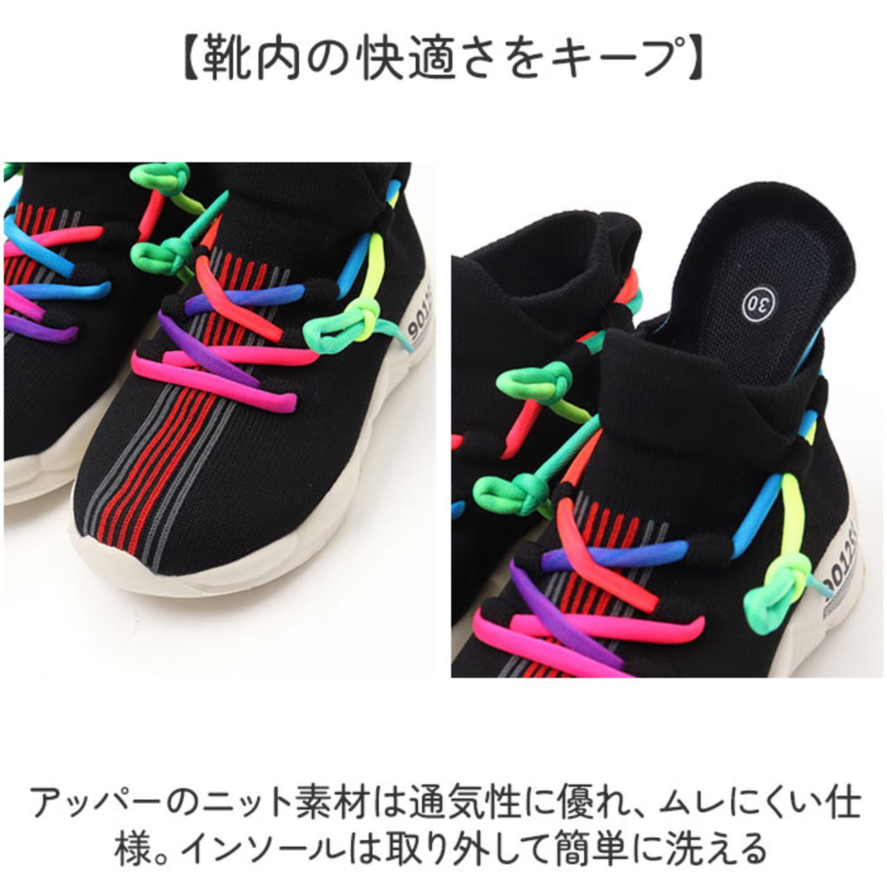 ・アッパーのニット素材は通気性に優れ、ムレにくい仕様。インソールは取り外して簡単に洗える