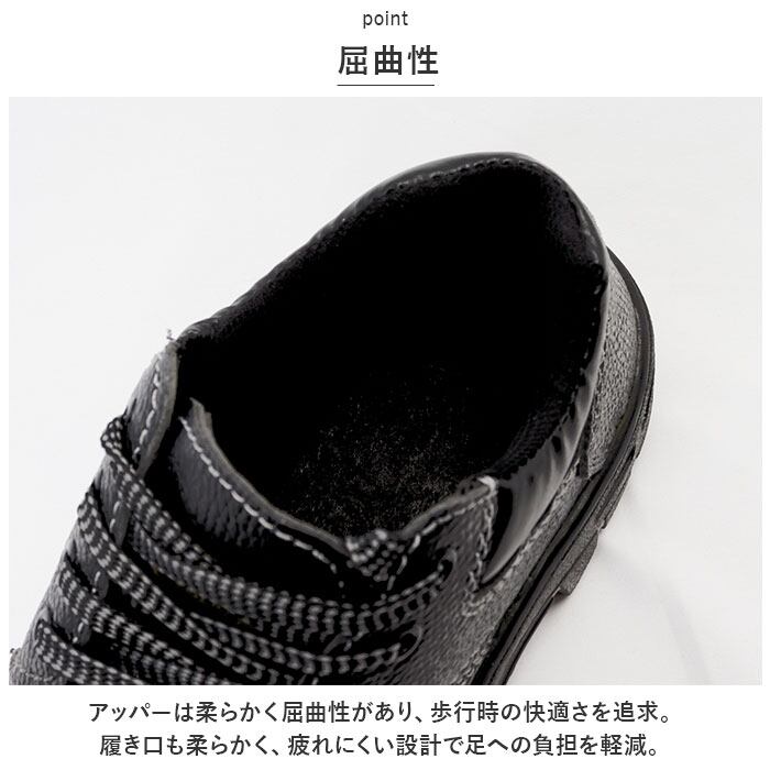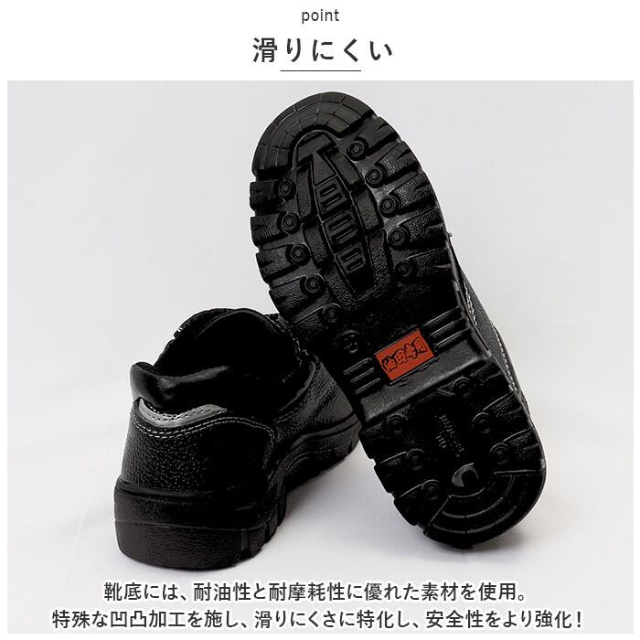 ・靴底には、耐油性と耐摩耗性に優れた素材を使用。特殊な凹凸加工を施し、滑りにくさに特化し、安全性をより強化!