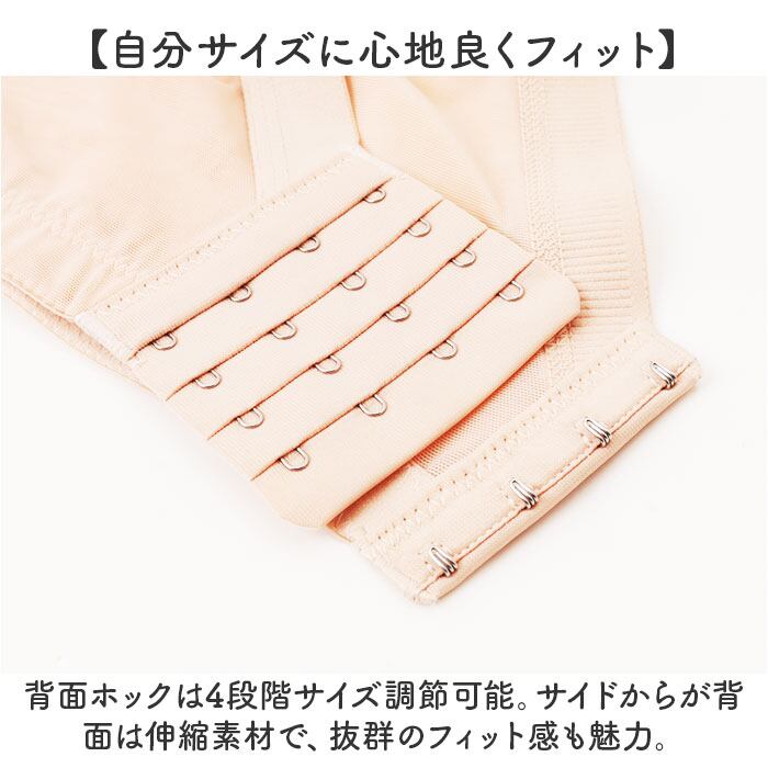 ・背面ホックは4段階サイズ調節可能。サイドからが背面は伸縮素材で、抜群のフィット感も魅力。