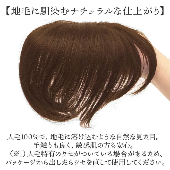・人毛100%で、地毛に溶け込むような自然な見た目。手触りも良く、敏感肌の方も安心。