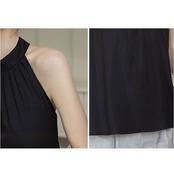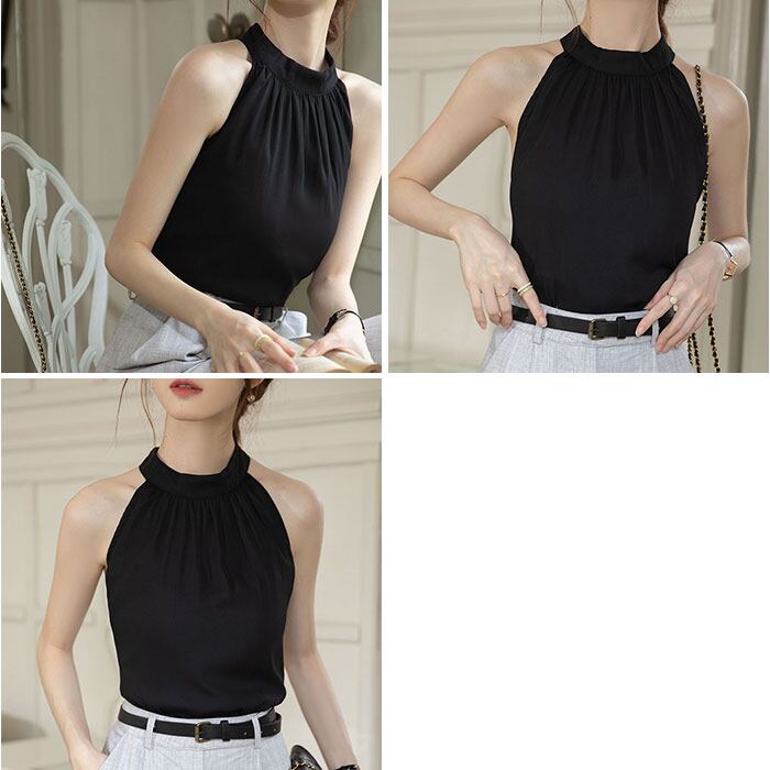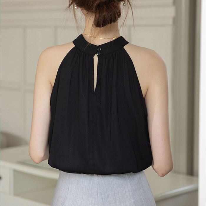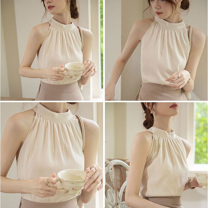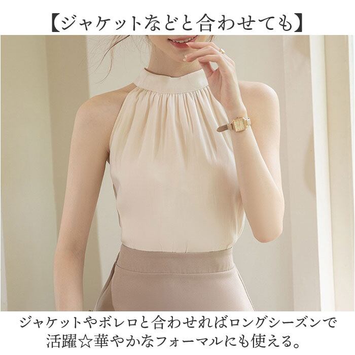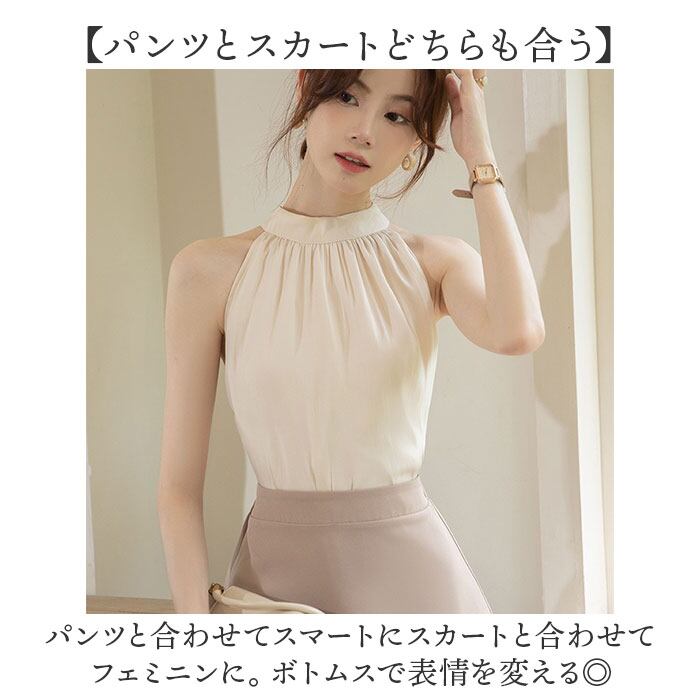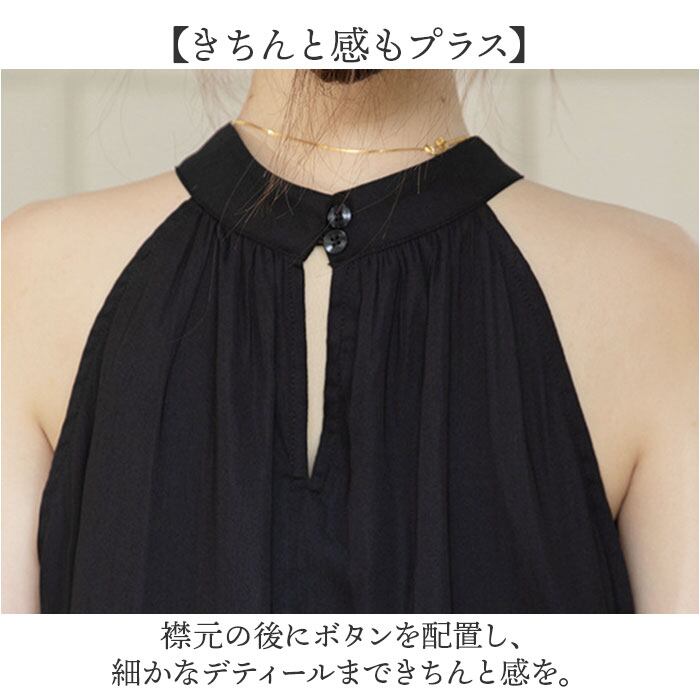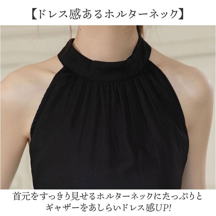・首元をすっきり見せるホルターネックにたっぷりとギャザーをあしらいドレス感UP!