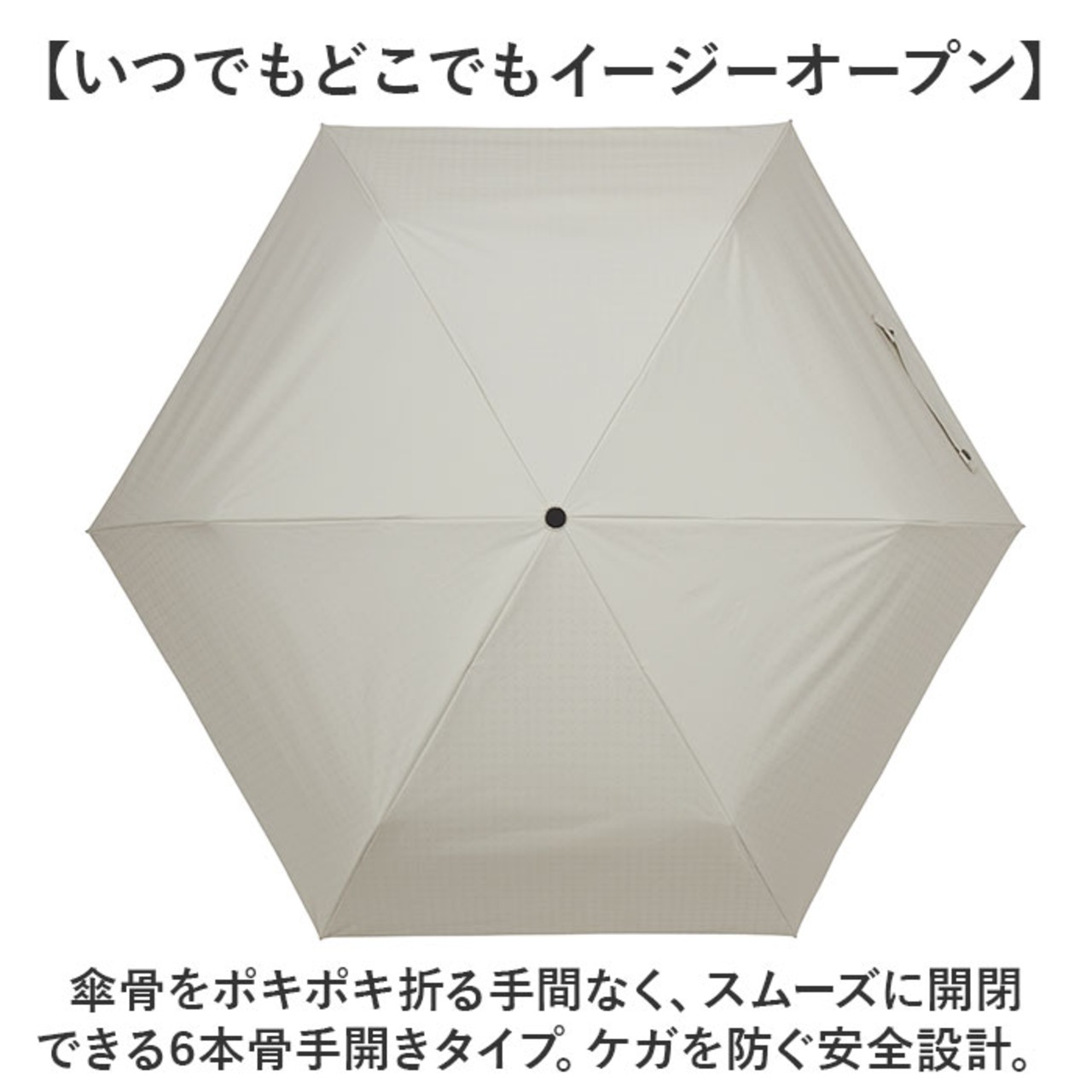・傘骨をポキポキ折る手間なく、スムーズに開閉できる6本骨手開きタイプ。ケガを防ぐ安全設計。