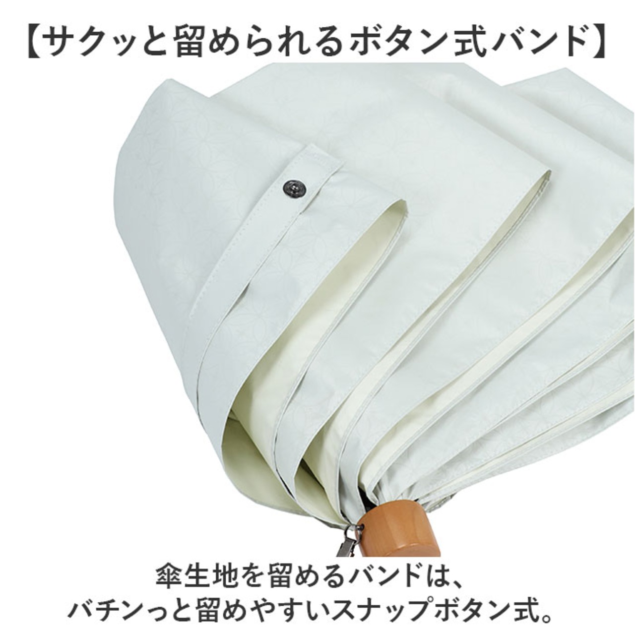 ・傘生地を留めるバンドは、バチンっと留めやすいスナップボタン式。