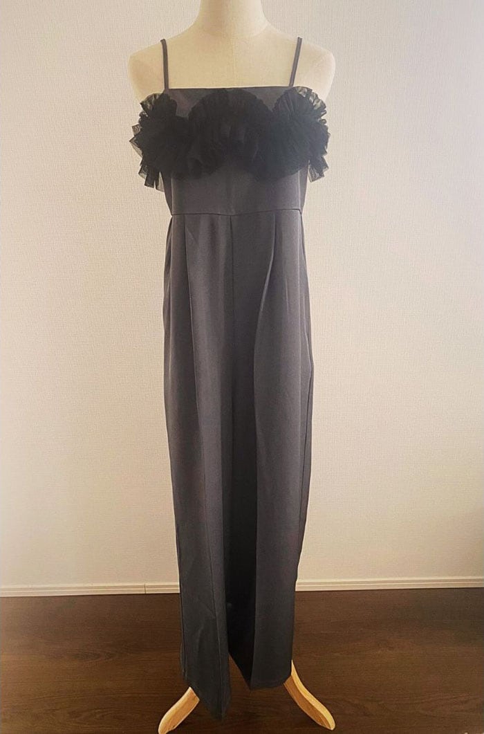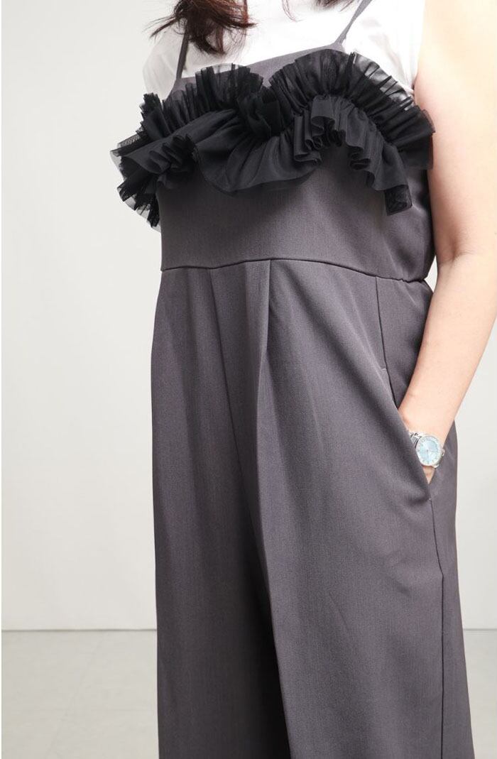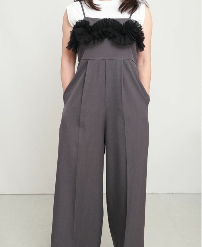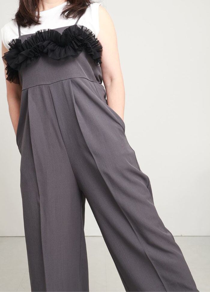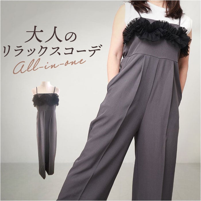 ・胸元にあしらわれたチュールがポイントのオールインワン