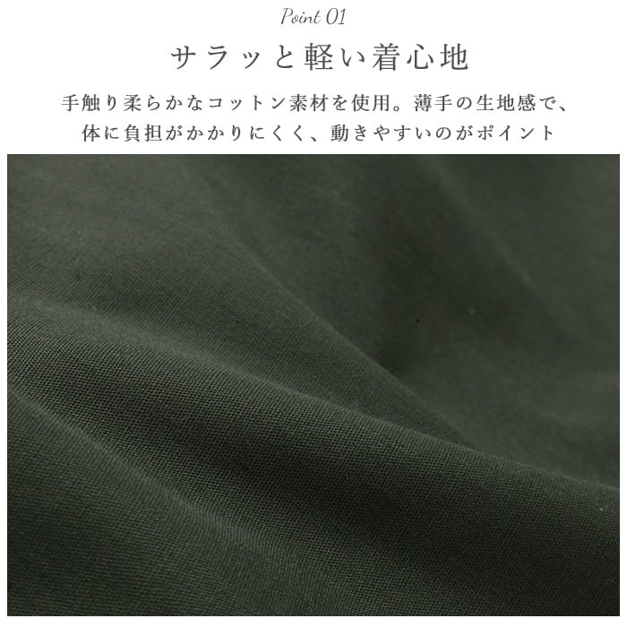 ・手触り柔らかなコットン素材を使用。薄手の生地感で、体に負担がかかりにくく、動きやすいのがポイント。