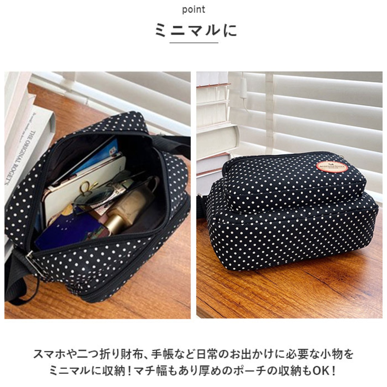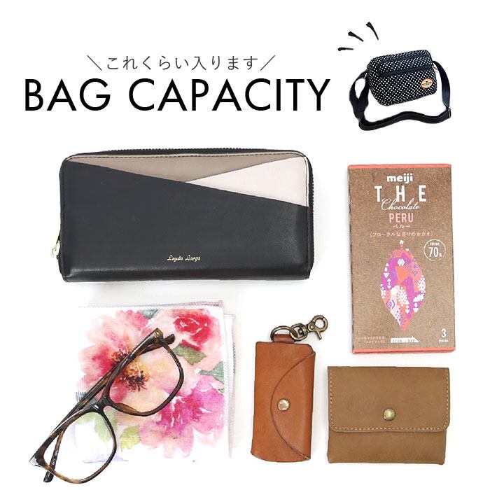 ・スマホや二つ折り財布、手帳など日常のお出かけに必要な小物をミニマルに収納!マチ幅もあり厚めのポーチの収納もOK!