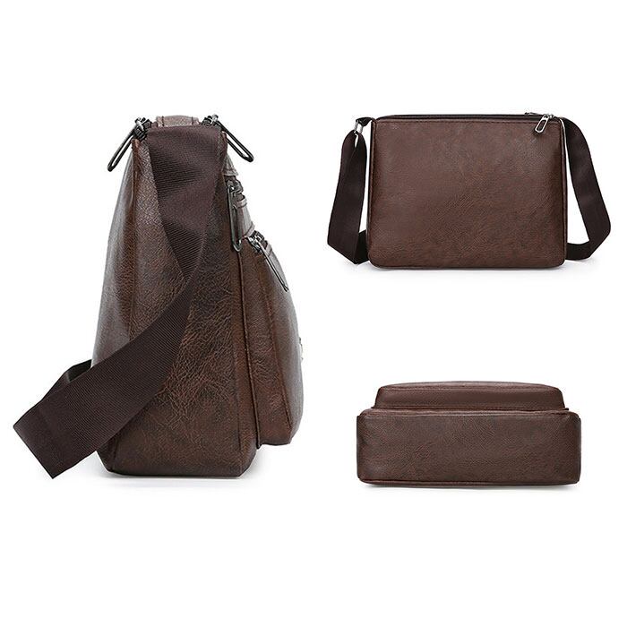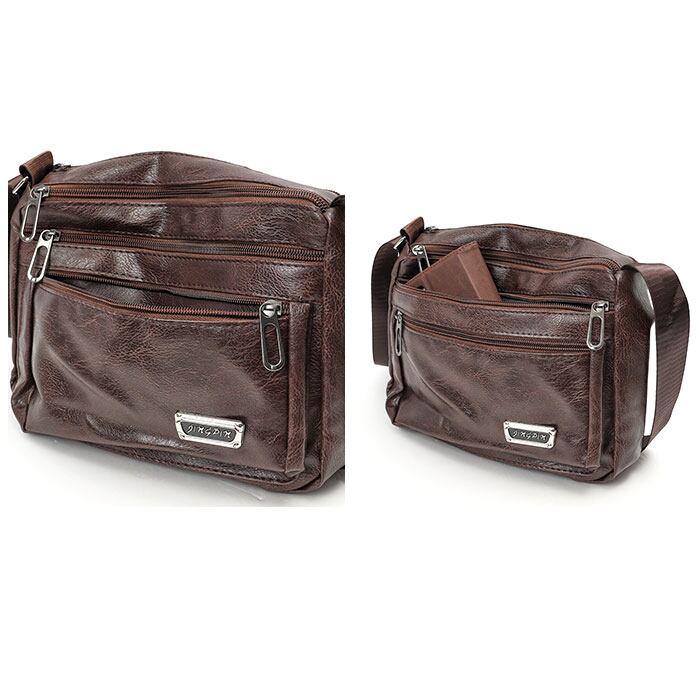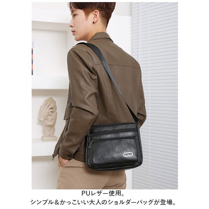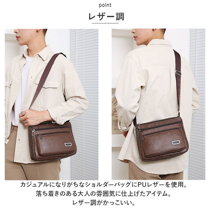 ・カジュアルになりがちなショルダーバッグにPUレザーを使用。落ち着きのある大人の雰囲気に仕上げたアイテム。レザー調がかっこいい。