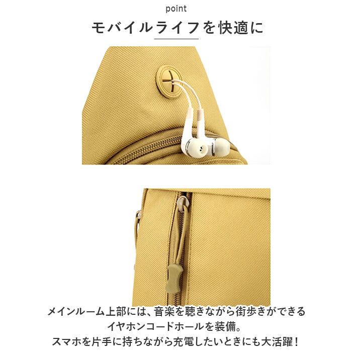 ・メインルーム上部には、音楽を聴きながら街歩きができるイヤホンコードホールを装備。スマホを片手に持ちながら充電したいときにも大活躍!