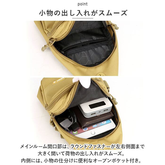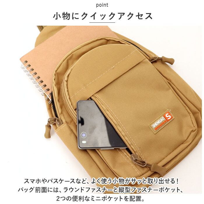 ・スマホやパスケースなど、よく使う小物がサッと取り出せる!バッグ前面には、ラウンドファスナーと縦型ファスナーポケット、2つの便利なミニポケットを配置。