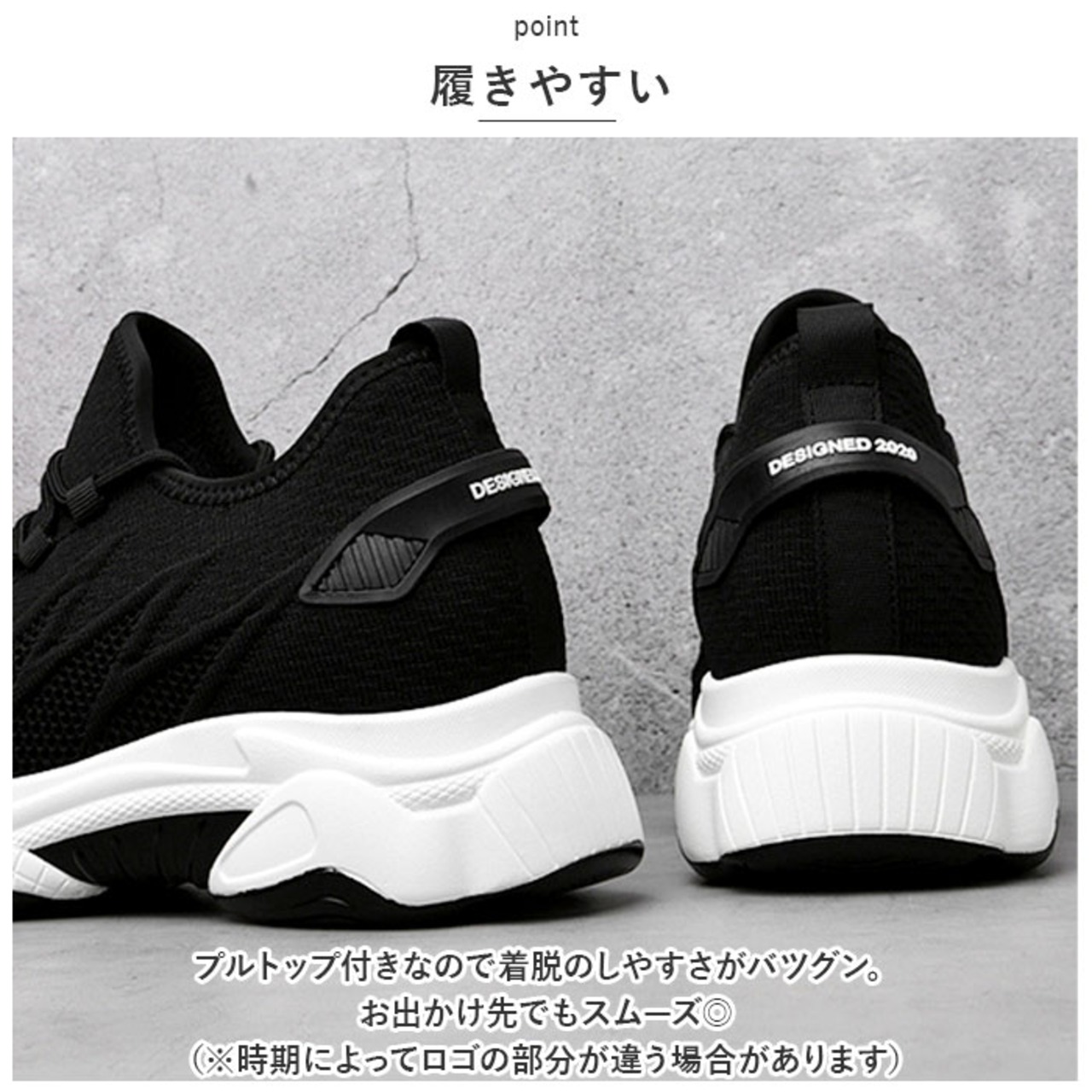 ・通気性のあるニット生地を使用し、蒸れにくい構造。1日中履いても快適な靴内をキープ!