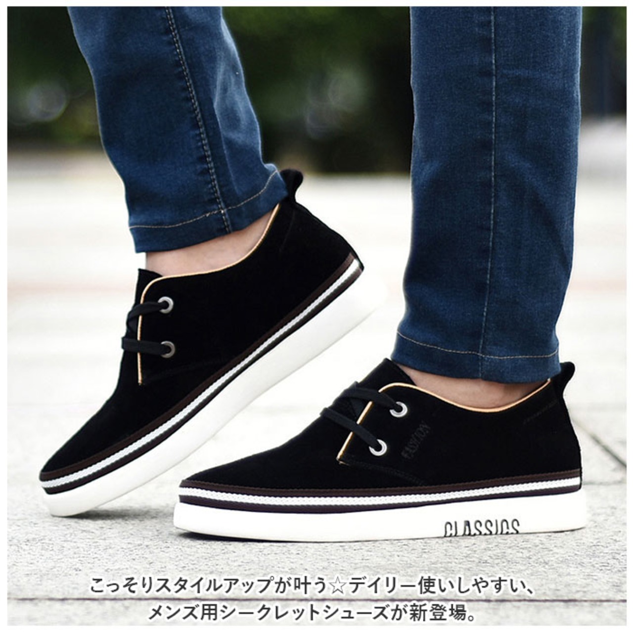 ・程よい厚みのソールに加え、高さを出すインヒールを装備。見た目は普通のシューズなのに、履くだけでちょこっと身長がアップ!