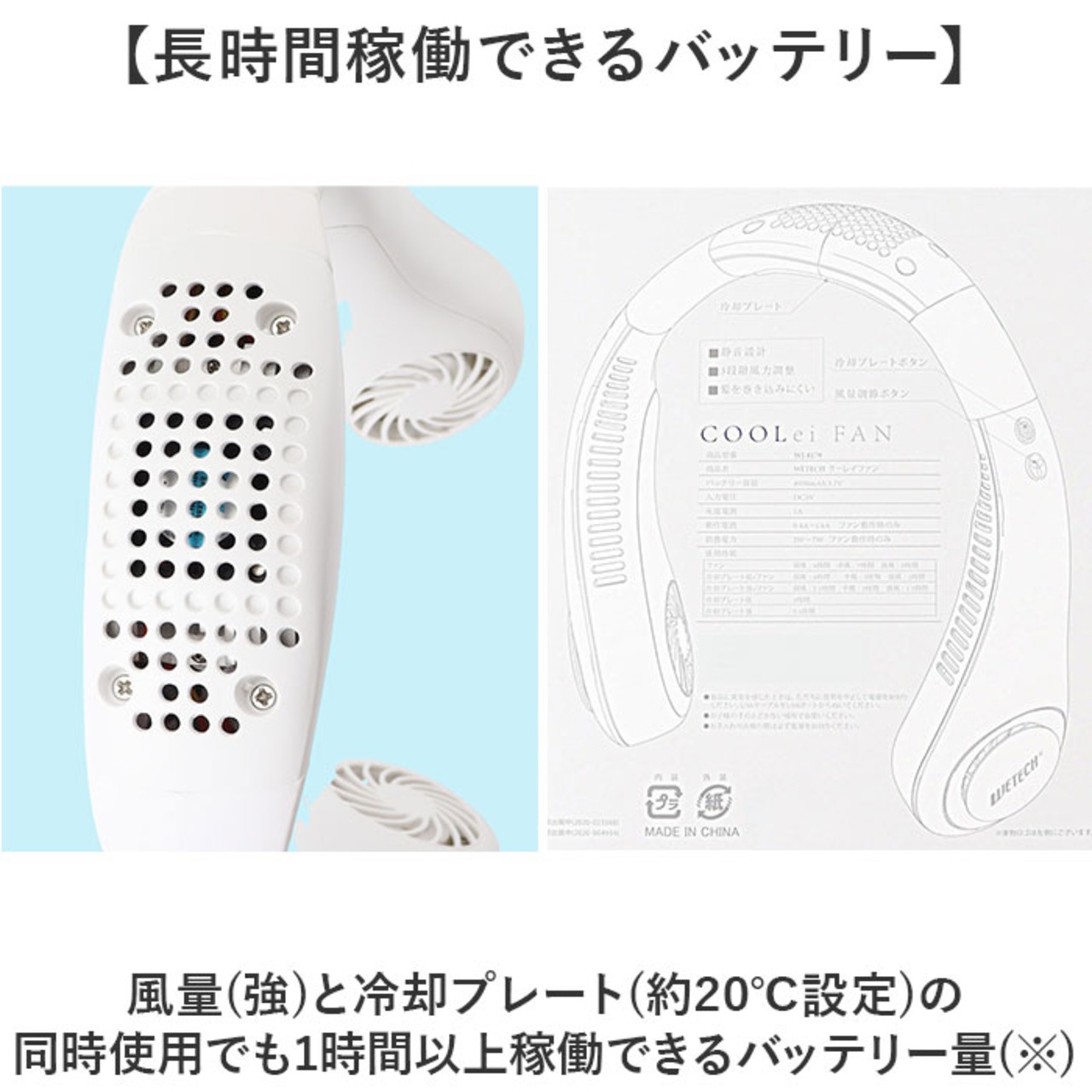 ・風量(強)と冷却プレート(約20℃設定)の同時使用でも1時間以上稼働できるバッテリー量