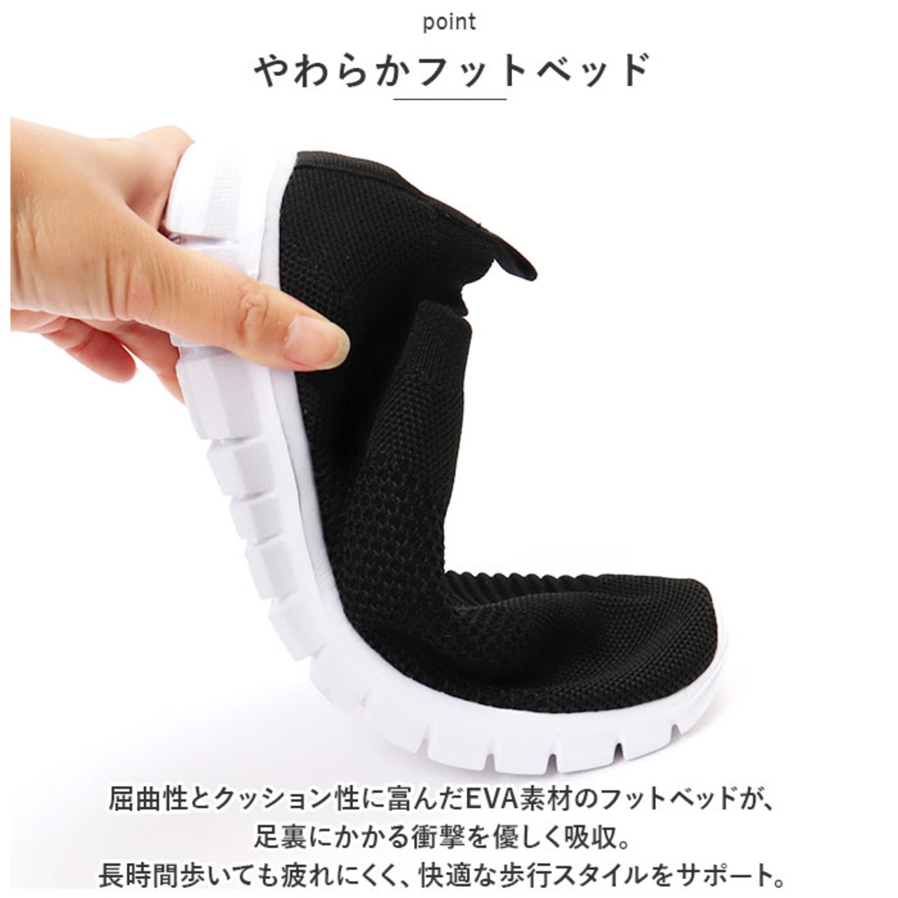 ・屈曲性とクッション性に富んだEVA素材のフットベッドが、足裏にかかる衝撃を優しく吸収。長時間歩いても疲れにくく、快適な歩行スタイルをサポート。