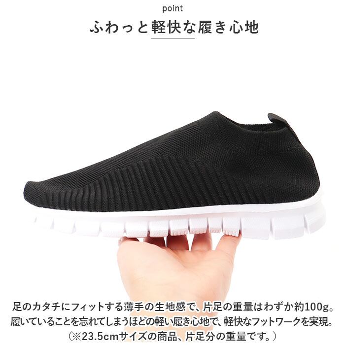 ・足のカタチにフィットする薄手の生地感で、片足の重量はわずか約100g。履いていることを忘れてしまうほどの軽い履き心地で、軽快なフットワークを実現。(※23.5cmサイズの商品、片足分の重量です。)