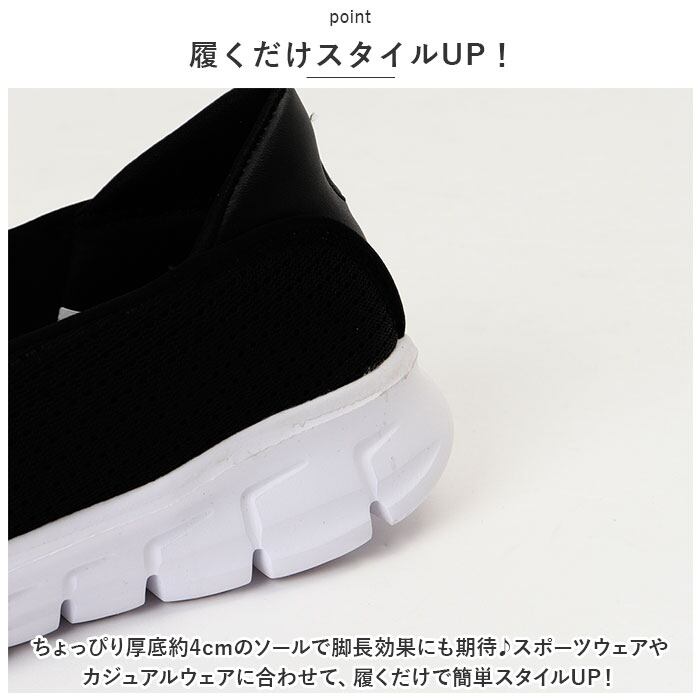 ・ちょっぴり厚底約4cmのソールで脚長効果にも期待♪スポーツウェアやカジュアルウェアに合わせて、履くだけで簡単スタイルUP!