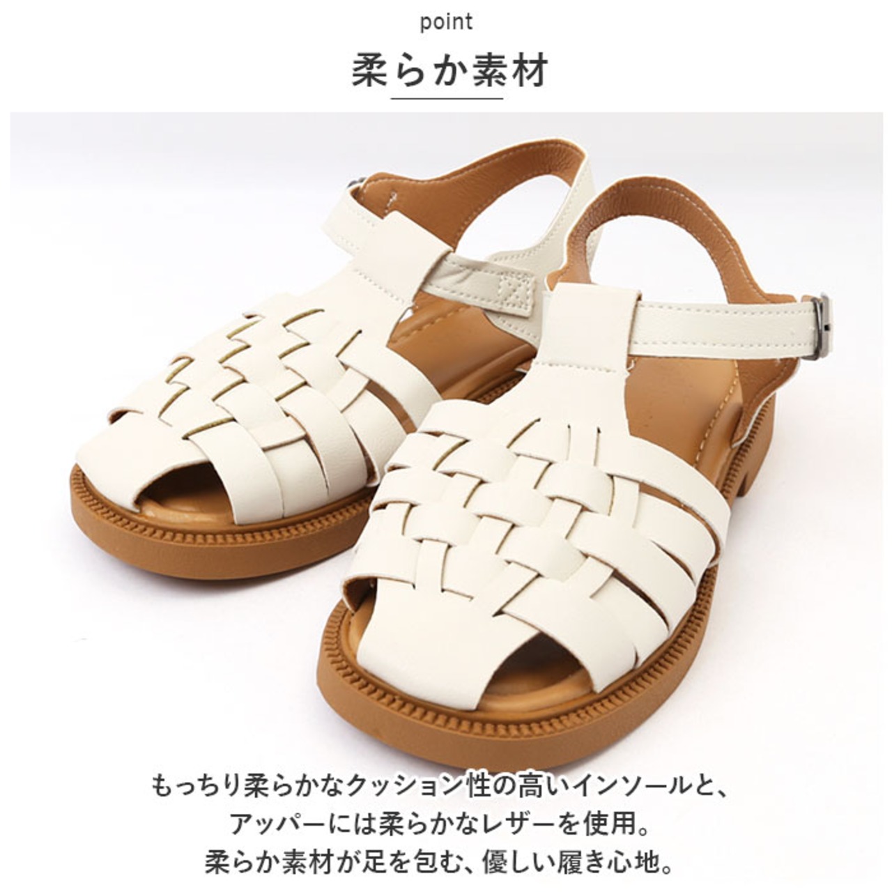 ・もっちり柔らかなクッション性の高いインソールと、アッパーには柔らかなレザーを使用。柔らか素材が足を包む、優しい履き心地。