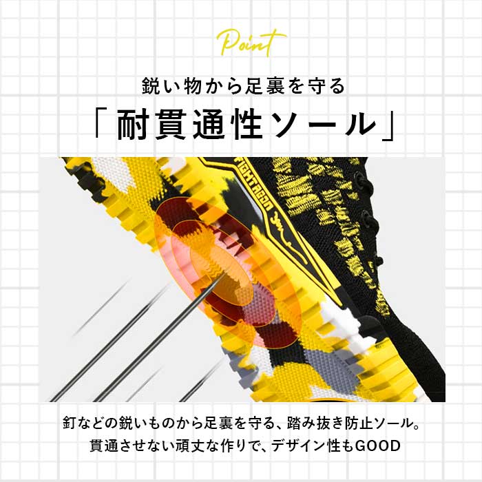 ・釘などの鋭いものから足裏を守る、踏み抜き防止ソールを採用。デザイン性も高くおしゃれさUP☆