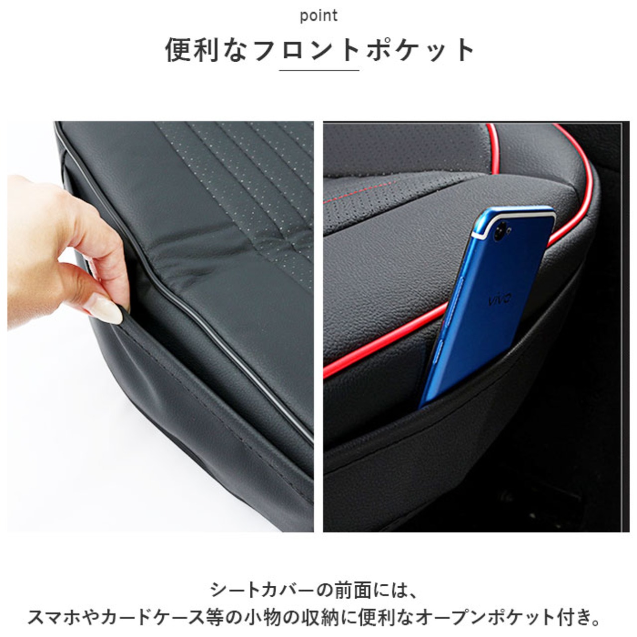 ・シートカバーの前面には、スマホやカードケース等の小物の収納に便利なオープンポケット付き。