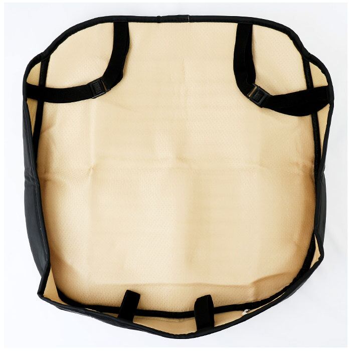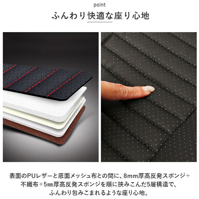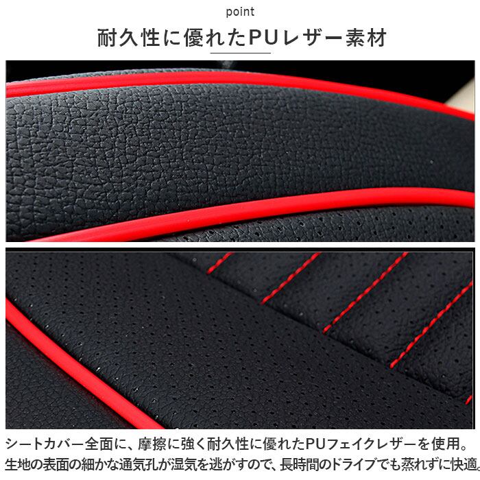 ・シートカバー全面に、摩擦に強く耐久性に優れたPUフェイクレザーを使用。生地の表面の細かな通気孔が湿気を逃がすので、長時間のドライブでも蒸れずに快適。