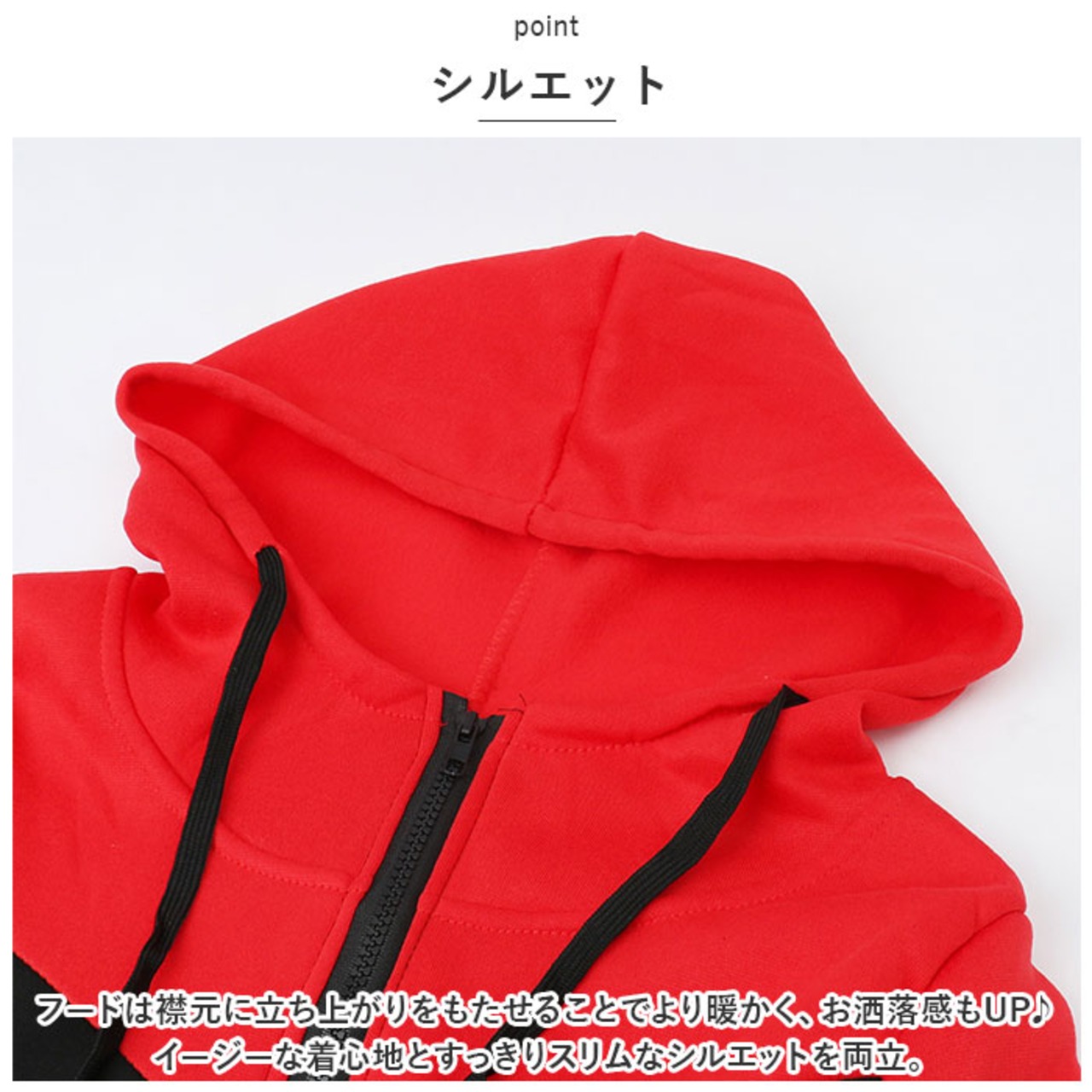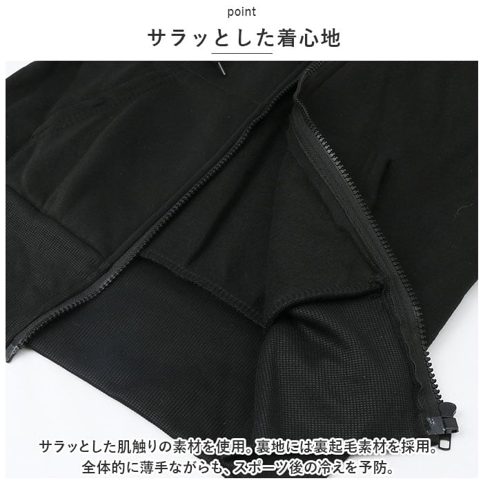 ・サラッとした肌触りの素材を使用。裏地には裏起毛素材を採用。全体的に薄手ながらも、スポーツ後の冷えを予防。