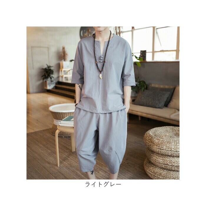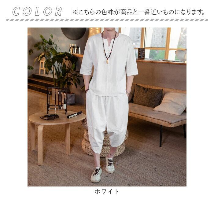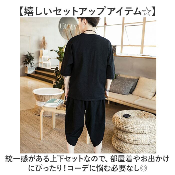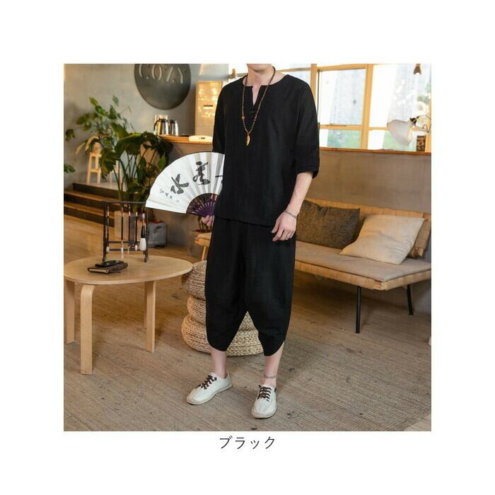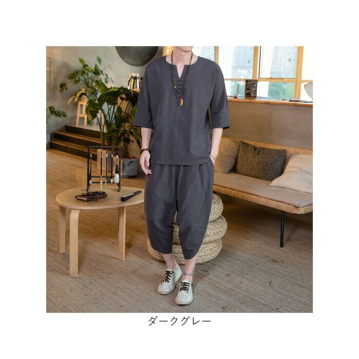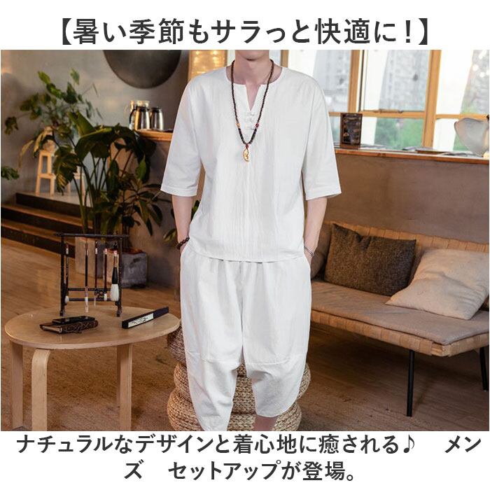 メンズ セットアップ 夏用 通販 半袖シャツ 半袖 五分丈 Tシャツ トップス サルエルパンツ 七分丈 パンツ ズボン 春夏 涼しい 上下セット 綿麻 リネン ゆったり 無地 カジュアル シンプル オシャレ おしゃれ 通気性 ルームウェア 父の日 ギフト