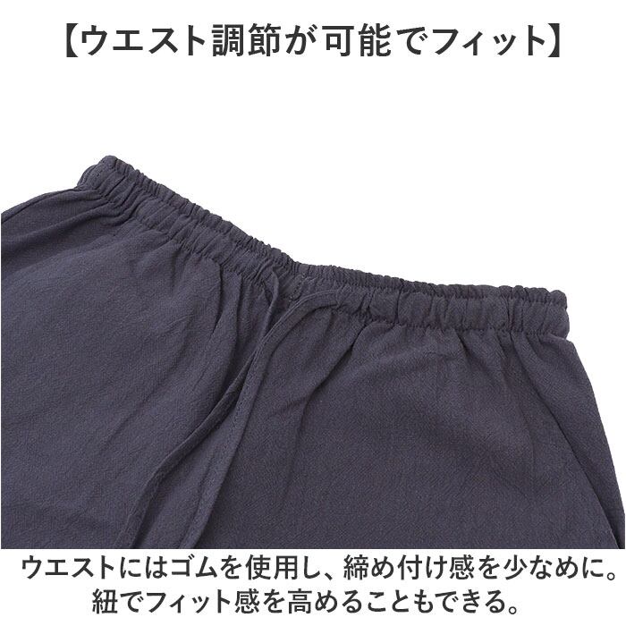 ・ウエストにはゴムを使用し、締め付け感を少なめに。紐でフィット感を高めることもできる。