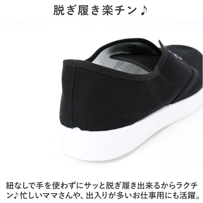 ・紐なしで手を使わずにサッと脱ぎ履き出来るからラクチン♪忙しいママさんや、出入りが多いお仕事用にも活躍。