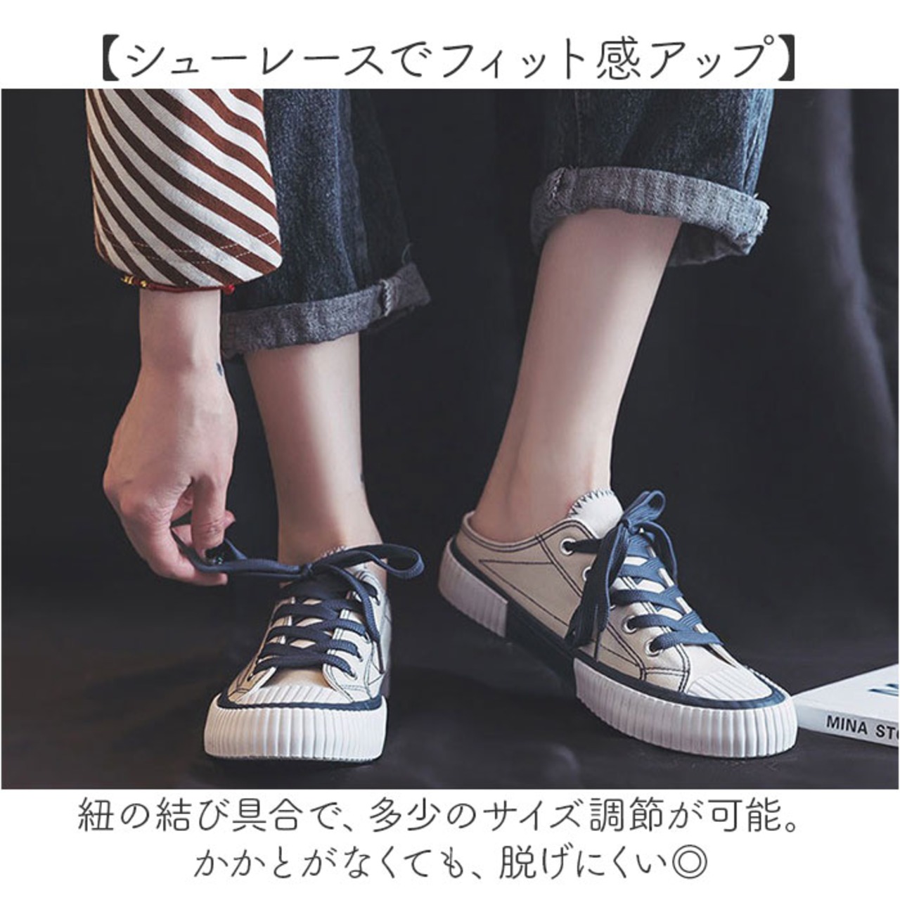 ・紐の結び具合で、多少のサイズ調節が可能。かかとがなくても、脱げにくい◎