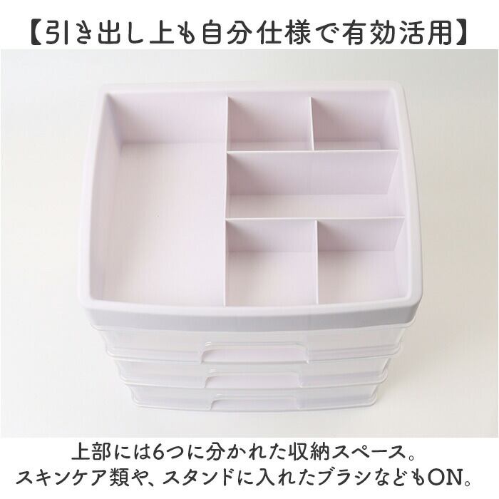 ・上部には6つに分かれた収納スペース。スキンケア類や、スタンドに入れたブラシなどもON。