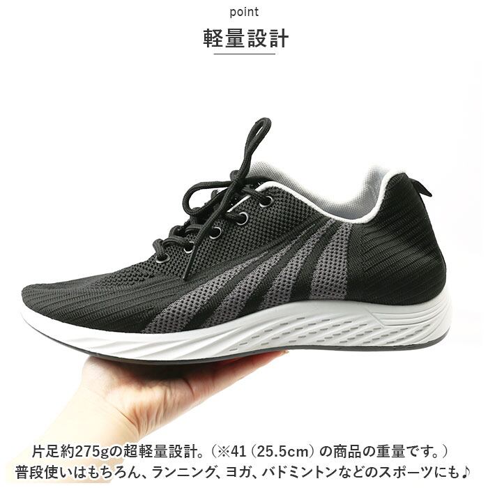 ・片足約275gの超軽量設計。(※41(25.5cm)の商品の重量です。)普段使いはもちろん、ランニング、ヨガ、バドミントンなどのスポーツにも♪