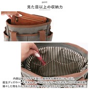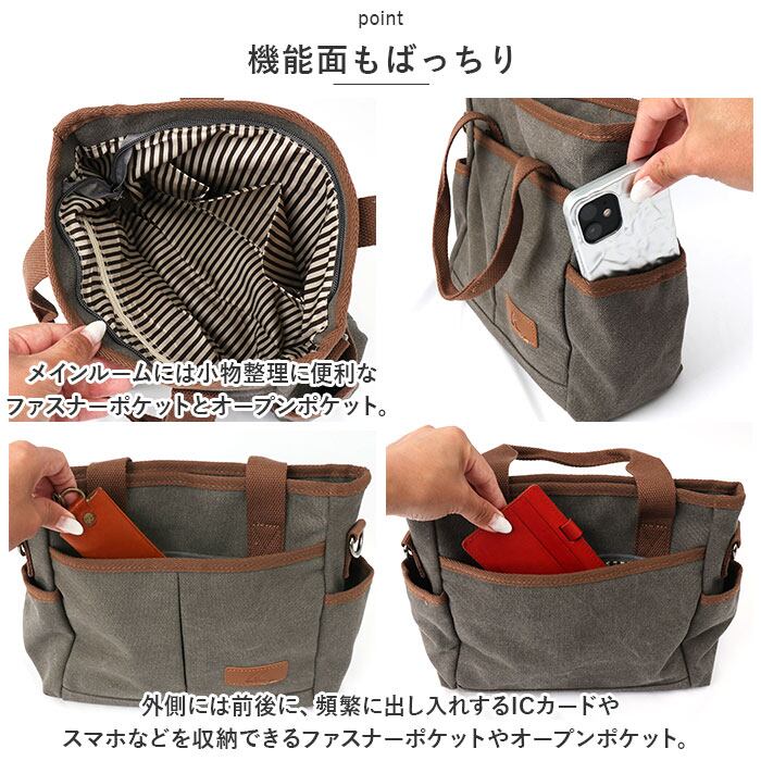 ・メインルームには小物整理に便利なファスナーポケットとオープンポケットを装備。外側には前後に、頻繁に出し入れするICカードやスマホなどを収納できるファスナーポケットやオープンポケットがあってコンパクトながらに機能面もばっちり。