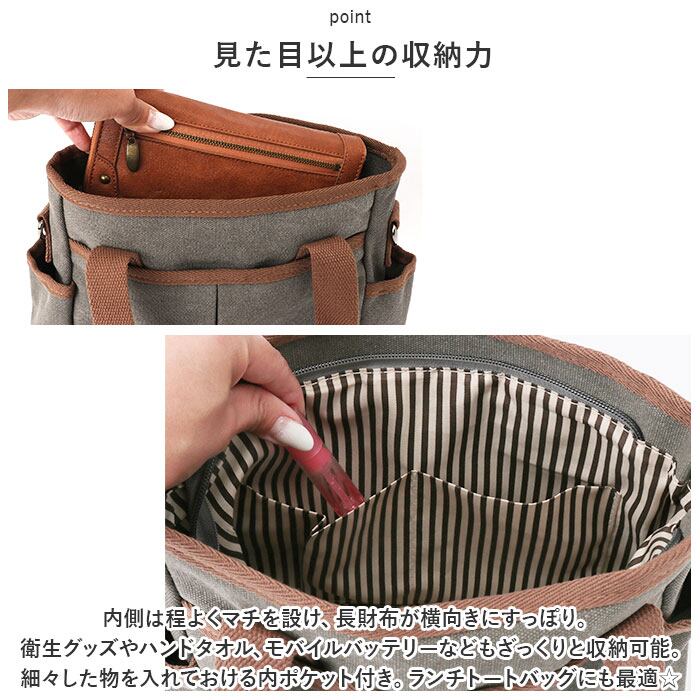 ・内側は程よくマチを設け、長財布が横向きにすっぽり。衛生グッズやハンドタオル、モバイルバッテリーなどもざっくりと収納可能。細々した物を入れておける内ポケット付き。ランチトートバッグにも最適☆