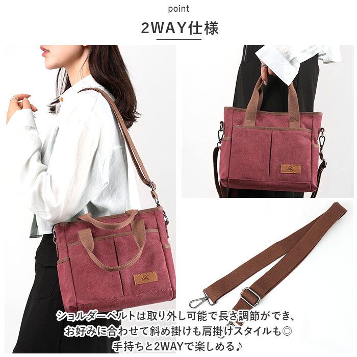 ・ショルダーベルトは取り外し可能で長さ調節ができ、お好みに合わせて斜め掛けも肩掛けスタイルも◎手持ちと2WAYで楽しめる♪