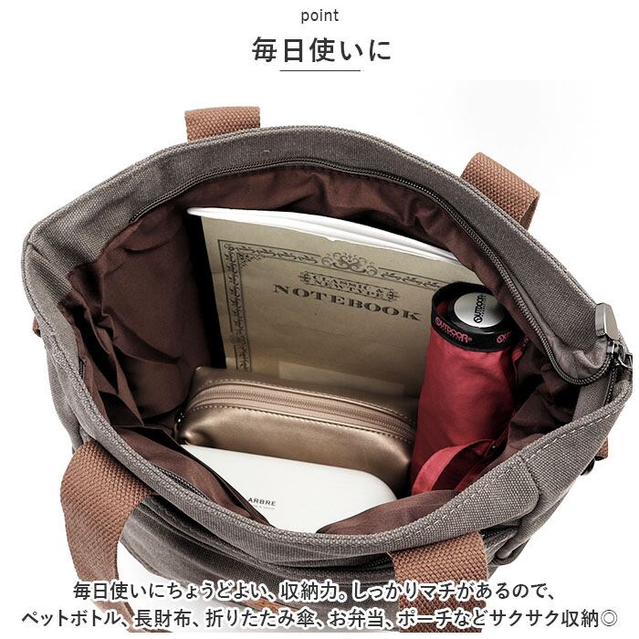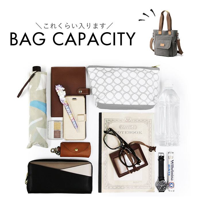 ・毎日使いにちょうどよい、収納力。しっかりマチがあるので、ペットボトル、長財布、折りたたみ傘、お弁当、ポーチなどサクサク収納できる。