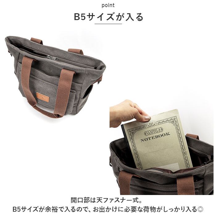 ・開口部は天ファスナー式。B5サイズが余裕で入るので、お出かけに必要な荷物がしっかり入る◎