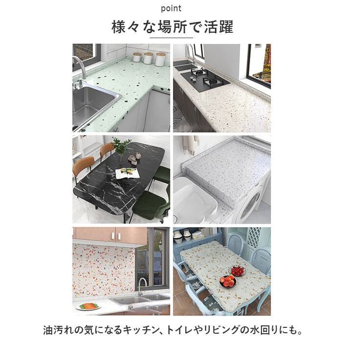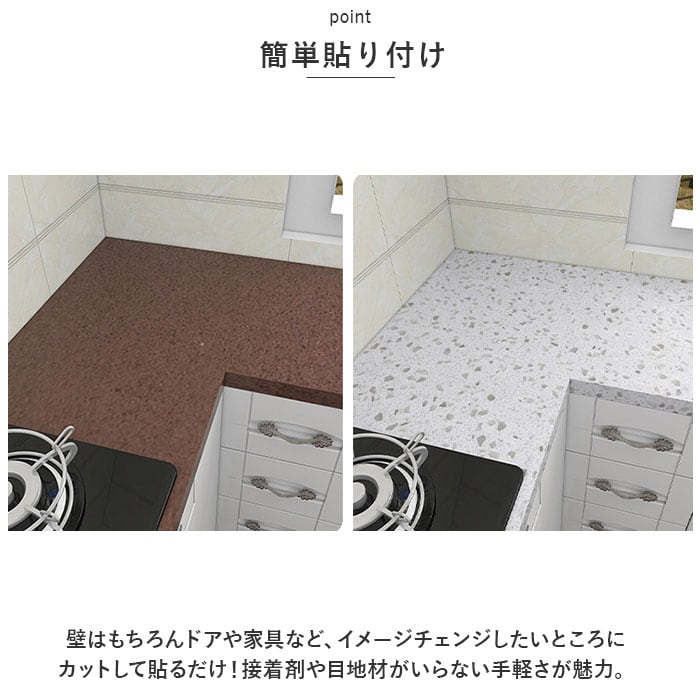 ・壁はもちろんドアや家具など、イメージチェンジしたいところにカットして貼るだけ!接着剤や目地材がいらない手軽さが魅力。
