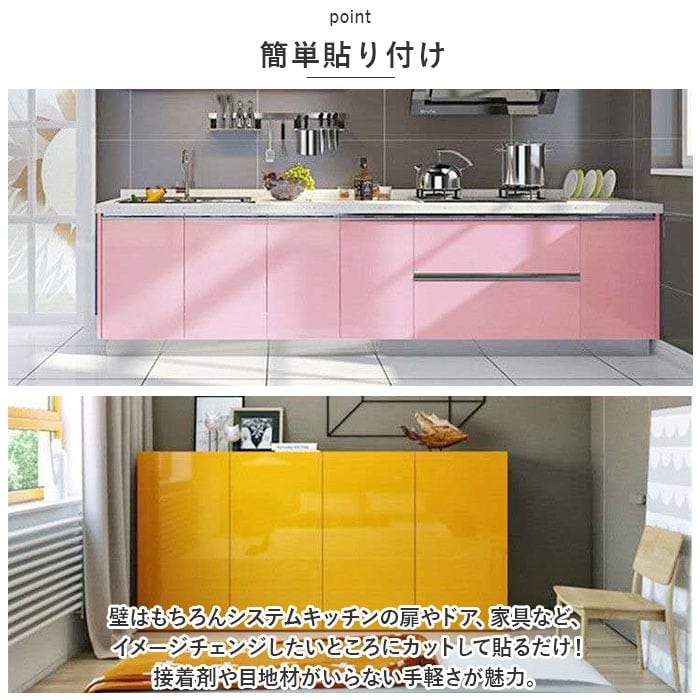 ・壁はもちろんシステムキッチンの扉やドア、家具など、イメージチェンジしたいところにカットして貼るだけ!接着剤や目地材がいらない手軽さが魅力。