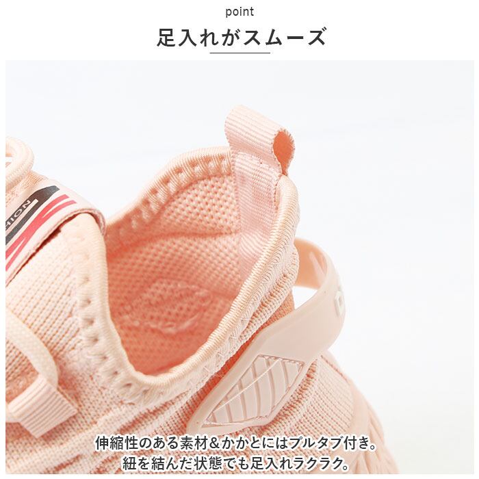 ・伸縮性のある素材&かかとにはプルタブ付き。紐を結んだ状態でも足入れラクラク。